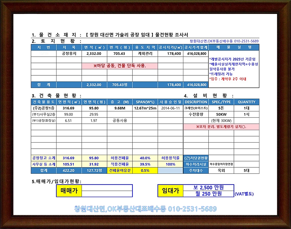 4.°Ç¹°:¾à128¤½(°øÀå96¤½+»ç¹«½Ç30¤½+±âŸ) Ãþ°í 9.7M, »ç¹«½Ç(2Ãþ) ¾à30¤½, Å©·¹ÀÎ5Åæ*1, Àü±â 100KW(¸ðÀںи®), ÇϼöÁ¾¸»Ã³¸®À忬°á