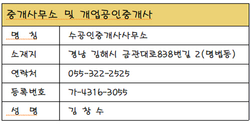 ¼ö°øÀÎÁß°³»ç»ç¹«¼Ò ( °æ³² ±èÇØ½Ã ¸í¹ýµ¿ 269¹øÁö)